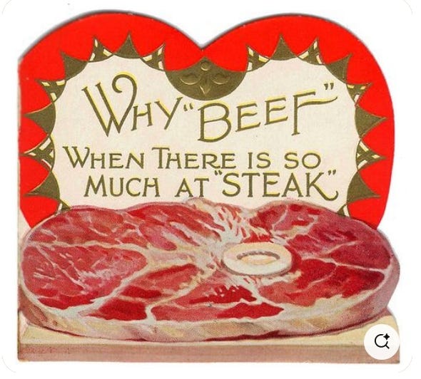 Still hungry fer more? “Meat me” halfway ta the corner diner! (sum’ a these high concept cards ya lookit an’ wunder WHAT in heck they were thinkin’! but of course I’m sho’ nuff grateful they survived ta make us smile…)